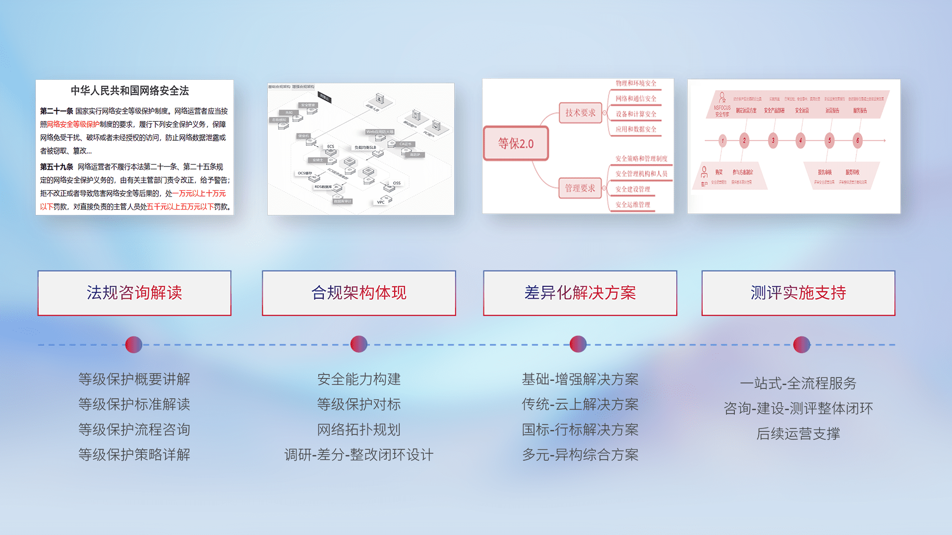 通过专业的法律咨询解读、、合规架构体现、、、差异化解决方案、、、测试实施支持等服务,,,,为客户量身打造等保合规体系。。